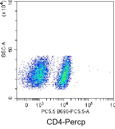 • Staining of normal human peripheral blood mononuclear cells (PBMCs) using Percp Anti-Human CD4 Antibody (Clone: RPA-T4) (Product No.: H0041). Analyzed data are derived from lymphocytes.