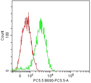 • Staining of platelets enriched from normal human peripheral blood using Percp Anti-Human CD42b Antibody (Clone: HIP1) (Product No.: H4046) (Green, red is blank cells). Analyzed data are derived from lymphocytes.