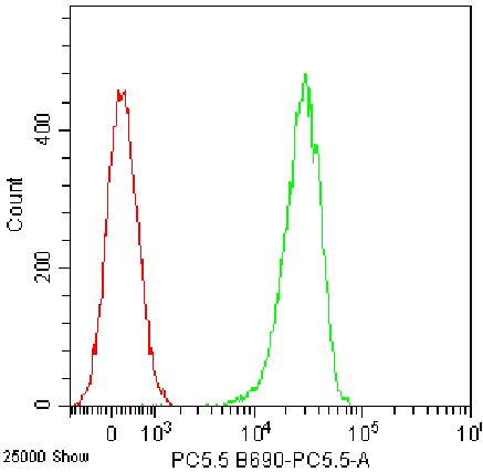 • Staining of normal human peripheral blood mononuclear cells (PBMCs) (green) using PerCP Human CD45 Antibody (Clone: 5B1) (Catalog Number: H0116) and blank control (red). Analysis data derived from lymphocytes.