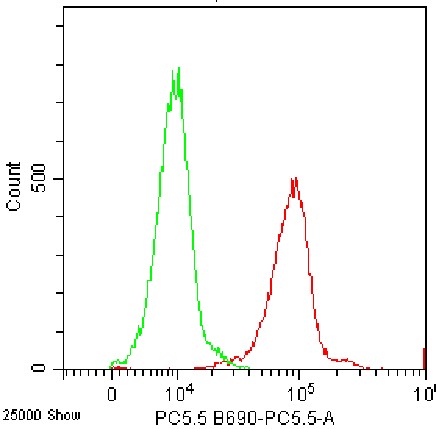 • Staining of normal human peripheral blood mononuclear cells (PBMCs) using Percp Anti-Human CD45 Antibody (Clone: HI30) (Product No.: H0101) (red, green is unstained control). Analyzed data are derived from lymphocytes.