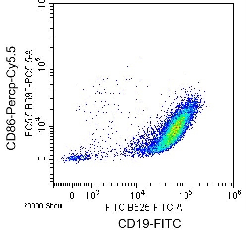 • Staining of fixed/permeabilized HEK-293F cells transfected with pCMV-Cd86(mouse)-3×FLAG-Neo plasmid using FITC Anti-CD19 Antibody and Percp Anti-Mouse CD86 Antibody (Clone: GL1) (Product No.: G4421). Analyzed data are derived from total cells.