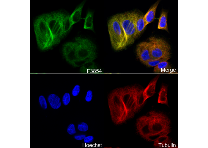 • Immunofluorescent analysis of SK-N-SH cells using F3854 (green, 1:100), Hoechst (blue) and tubulin (Red).