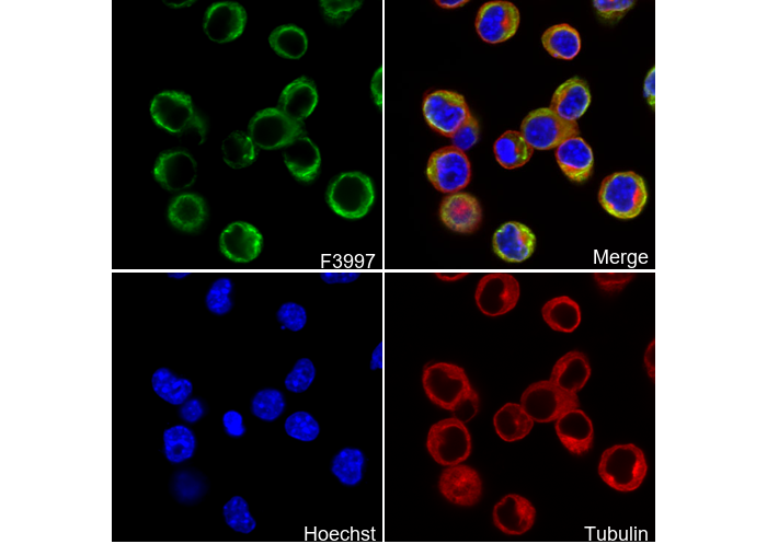 • Immunofluorescent analysis of Neuro-2a cells using F3997 (green, 1:100), Hoechst (blue) and tubulin (Red).