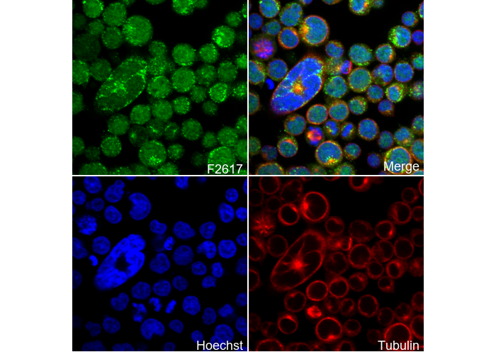 • Immunofluorescent analysis of Jurkat cells using F2617 (green, 1:50), Hoechst (blue) and tubulin (Red).