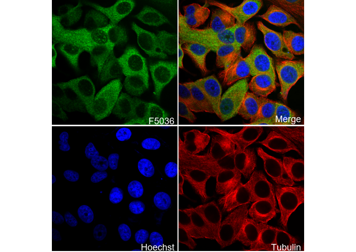 • Immunofluorescent analysis of MCF-7 cells using F5036 (green, 1:800), Hoechst (blue) and tubulin (Red).