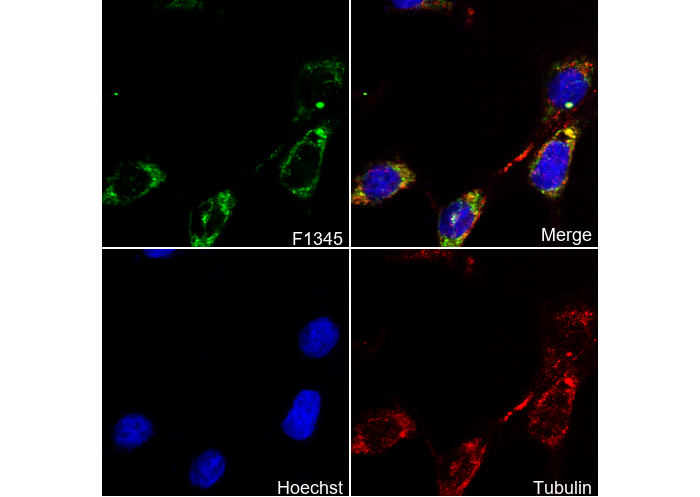 • Immunofluorescent analysis of HT1080 cells using F1345 (green, 1:200), Hoechst (blue) and tubulin (Red).