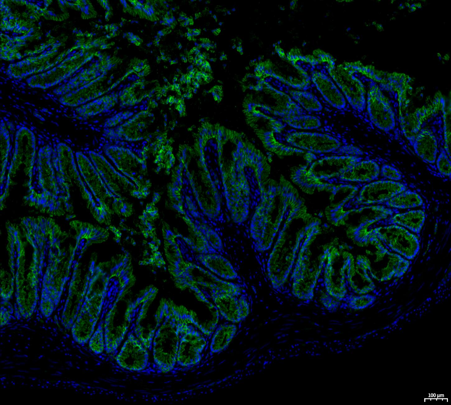• Immunofluorescent analysis of Mouse colon tissue using F0297 (green, 1:100) and Hoechst (blue).