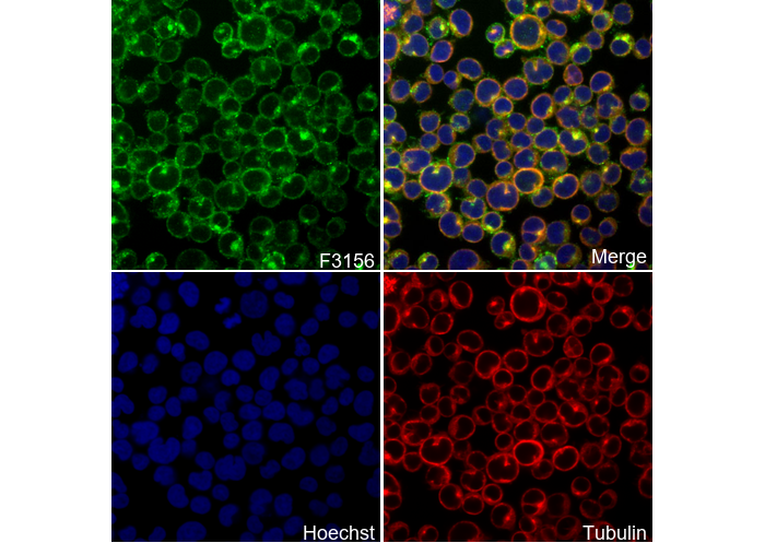 • Immunofluorescent analysis of Jurkat cells using F3156 (green, 1:250), Hoechst (blue) and tubulin (Red).