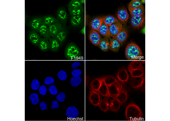 • Immunofluorescent analysis of HT-29 cells using F1949 (green, 1:300), Hoechst (blue) and tubulin (Red).