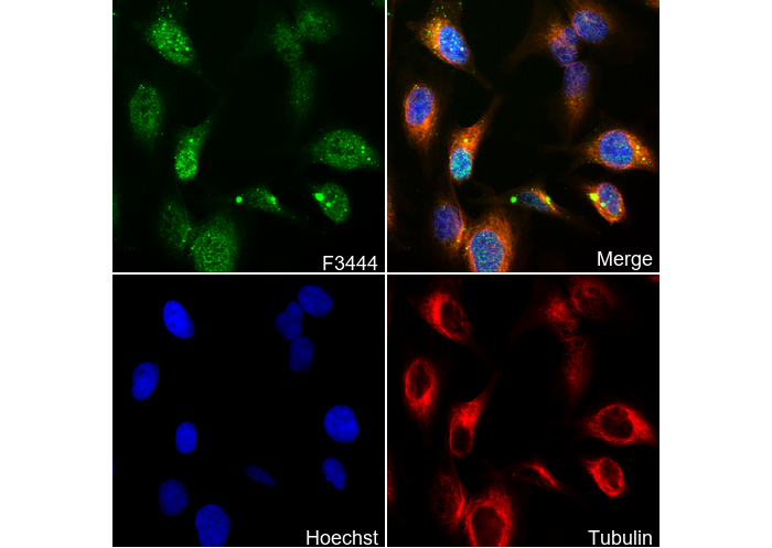 • Immunofluorescent analysis of Hela cells using F3444 (green, 1:100), Hoechst (blue) and tubulin (Red).