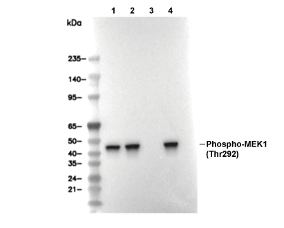 Phospho-MEK1 (Thr292) Antibody [F18G17] 仅识别 Thr292 处磷酸化的内源性 MEK1 蛋白水平。