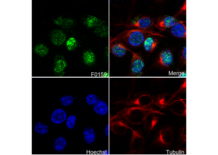 • Immunofluorescent analysis of COS-7 cells using F0159 (green, 1:800), Hoechst (blue) and tubulin (Red).