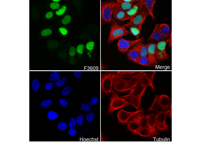 • Immunofluorescent analysis of MCF-7 cells using F3609 (green, 1:50), Hoechst (blue) and tubulin (Red).