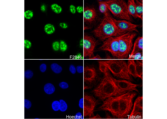 • Immunofluorescent analysis of A549 cells using F2846 (green, 1:100), Hoechst (blue) and tubulin (Red).