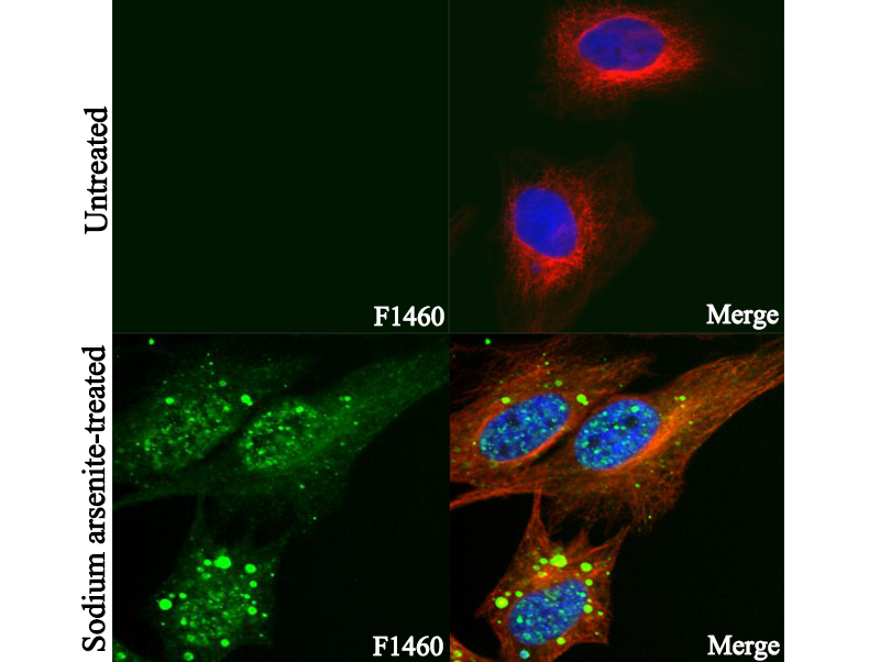 • Immunofluorescent analysis of PC-3 cells, untreated (upper) and sodium arsenite-treated (15 μM, 18 h) (lower), using F1460(green, 1:800), Hoechst (blue) and tubulin (Red).