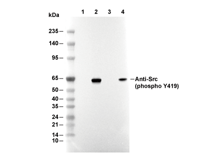 Phospho-Src (Tyr419) Antibody [D21H6] 仅识别 Tyr419 处磷酸化的内源性 Src 蛋白水平。
