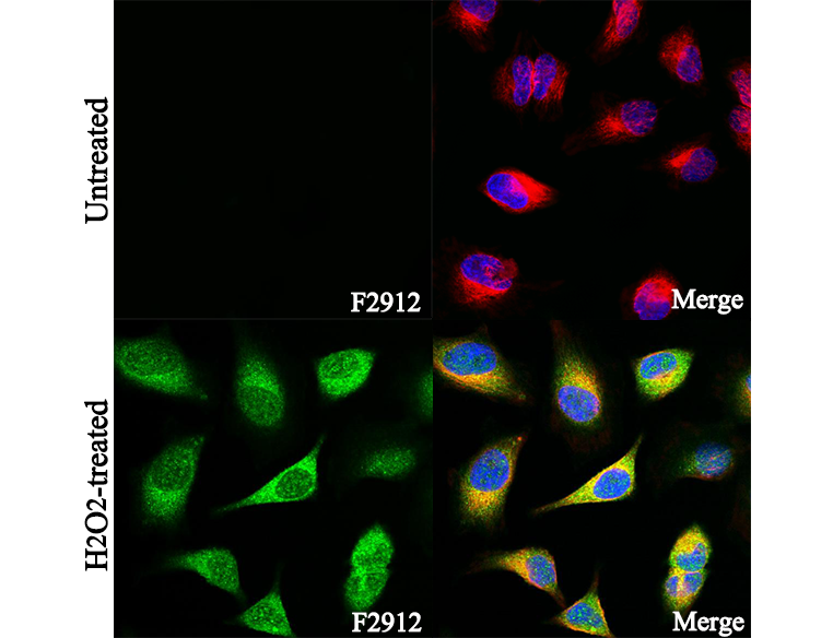 • Immunofluorescent analysis of HeLa cells, untreated (upper) and H2O2-treated (10mM, 1h)(lower), using F2912(green, 1:800), Hoechst (blue) and tubulin (Red).