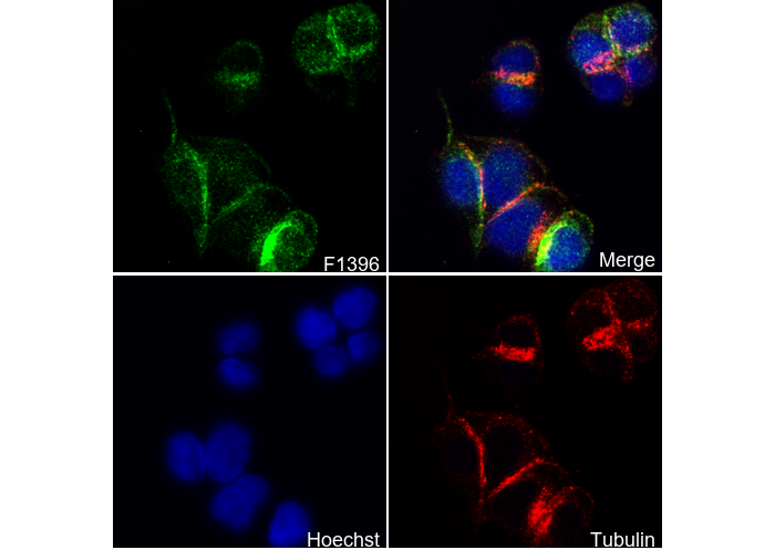 • Immunofluorescent analysis of HT-29 cells using F1396 (green, 1:800), Hoechst (blue) and tubulin (Red).