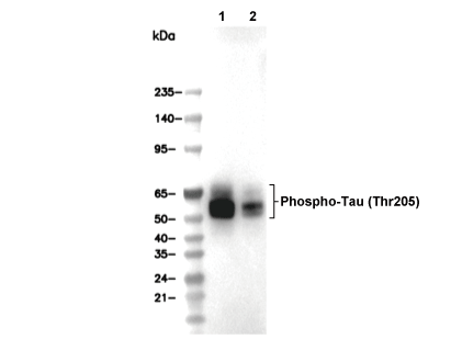 Phospho-Tau (Thr205) Antibody [J19P9] 仅识别 Thr205 处磷酸化的内源性 Tau 蛋白水平。