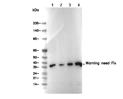 • Lane 1: Jurkat, Lane 2: Raji, Lane 3: Mouse heart, Lane 4: Rat heart