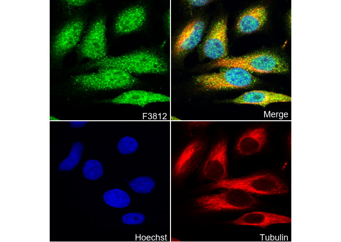 • Immunofluorescent analysis of Hela cells using F3812 (green, 1:400), Hoechst (blue) and tubulin (Red).