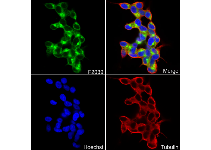 • Immunofluorescent analysis of SH-SY5Y cells using F2039 (green, 1:50), Hoechst (blue) and tubulin (Red).
