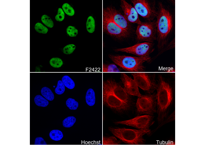 • Immunofluorescent analysis of Hela cells using F2422 (green, 1:2000), Hoechst (blue) and tubulin (Red).