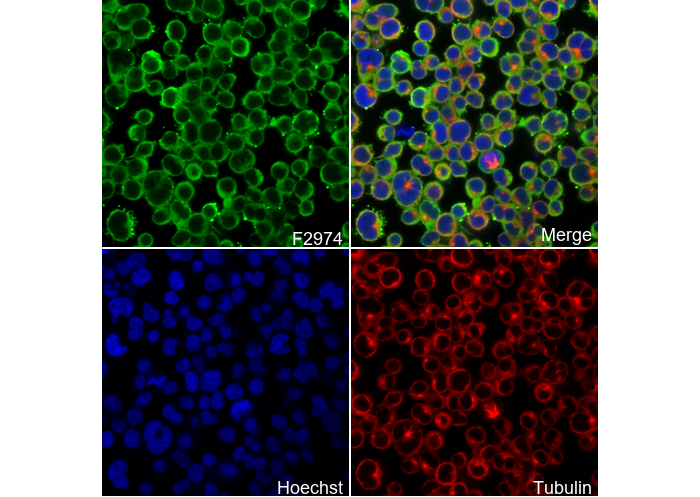 • Immunofluorescent analysis of Jurkat cells using F2974 (green, 1:100), Hoechst (blue) and tubulin (Red).