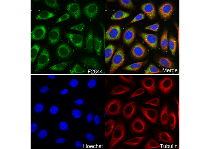• Immunofluorescent analysis of HepG2 cells using F2844 (green, 1:200), Hoechst (blue) and tubulin (Red).