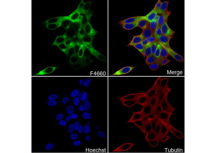 • Immunofluorescent analysis of LNCaP cells using F4660 (green, 1:200), Hoechst (blue) and tubulin (Red).
