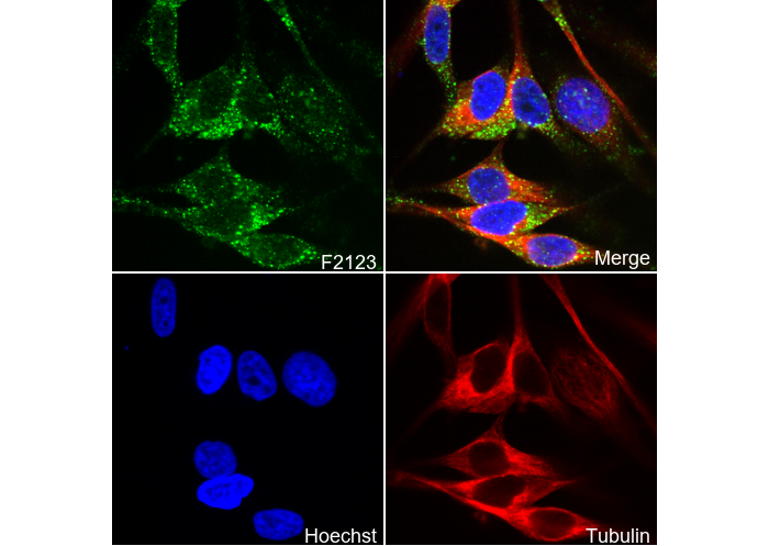 • Immunofluorescent analysis of Hela cells using F2123 (green, 1:400), Hoechst (blue) and tubulin (Red).