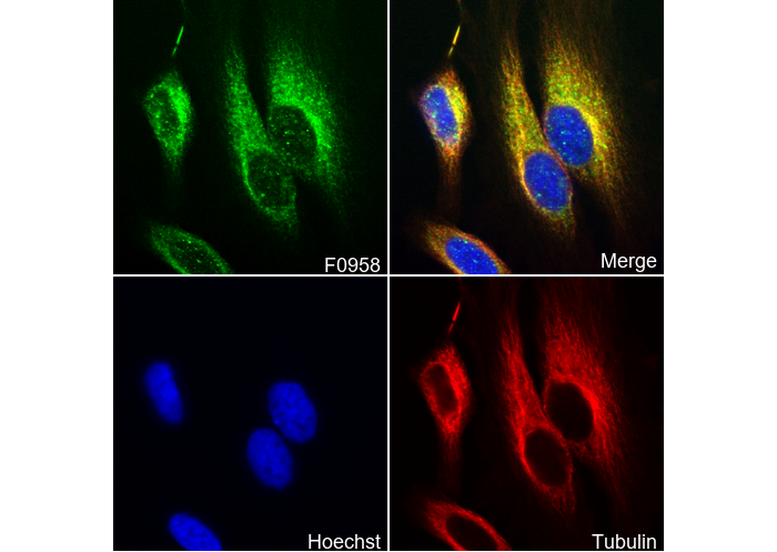 • Immunofluorescent analysis of Hela cells using F0958 (green, 1:800), Hoechst (blue) and tubulin (Red).