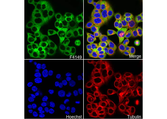 • Immunofluorescent analysis of HT-29 cells using F4149 (green, 1:800), Hoechst (blue) and tubulin (Red).
