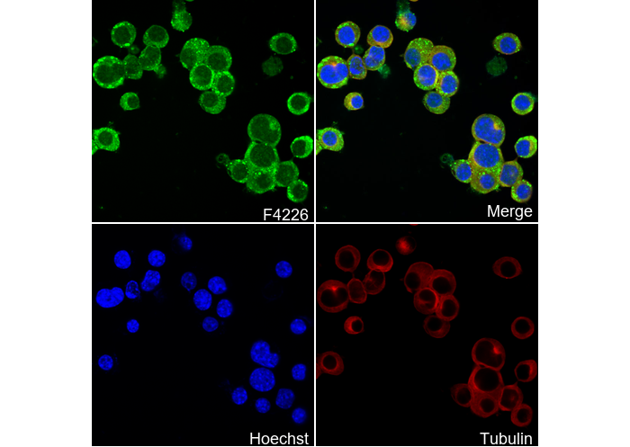 • Immunofluorescent analysis of Neuro-2a cells using F4226 (green, 1:400), Hoechst (blue) and tubulin (Red).