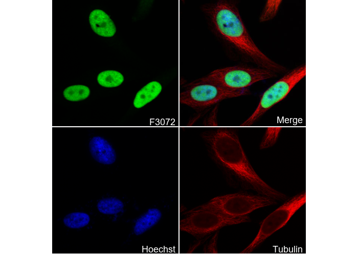 • Immunofluorescent analysis of Hela cells using F3072 (green, 1:800), Hoechst (blue) and tubulin (Red).