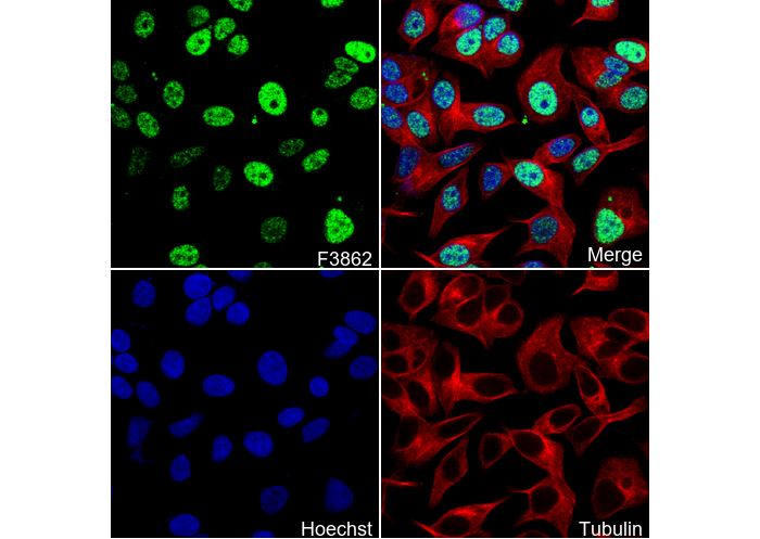• Immunofluorescent analysis of MCF-7 cells using F3862 (green, 1:500), Hoechst (blue) and tubulin (Red).