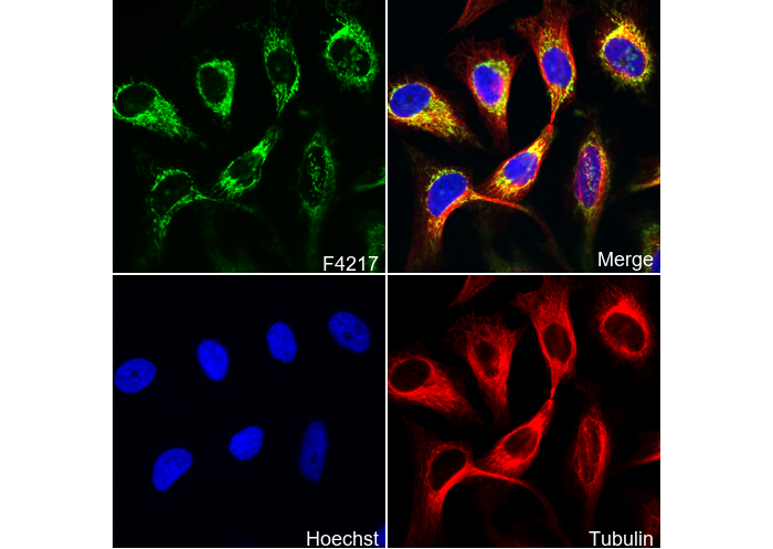 • Immunofluorescent analysis of Hela cells using F4217 (green, 1:50), Hoechst (blue) and tubulin (Red).