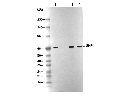 • Lane 1: THP-1, Lane 2: THP-1 (KO PTPN6), Lane 3: Jurkat, Lane 4: C6