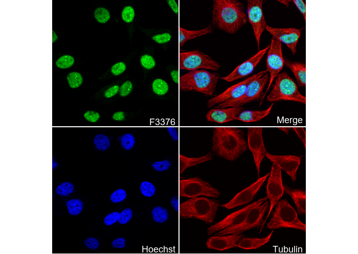 • Immunofluorescent analysis of Hela cells using F3376 (green, 1:1000), Hoechst (blue) and tubulin (Red).
