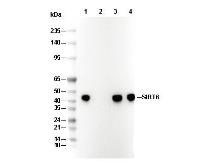 • Lane 1: HeLa, Lane 2: HeLa (KO SIRT6), Lane 3: Jurkat, Lane 4: HCT116