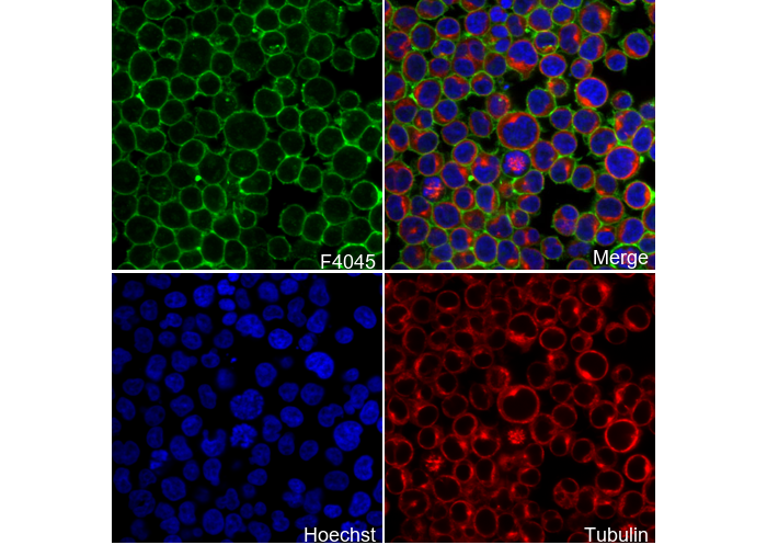 • Immunofluorescent analysis of Jurkat cells using F4045 (green, 1:50), Hoechst (blue) and tubulin (Red).