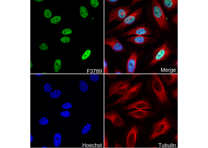 • Immunofluorescent analysis of Hela cells using F3789 (green, 1:100), Hoechst (blue) and tubulin (Red).