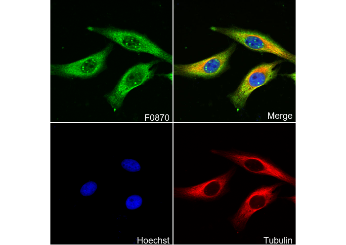 • Immunofluorescent analysis of Hela cells using F0870 (green, 1:200), Hoechst (blue) and tubulin (Red).