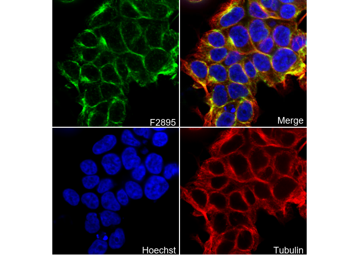 • Immunofluorescent analysis of 293T cells using F2895 (green, 1:200), Hoechst (blue) and tubulin (Red).