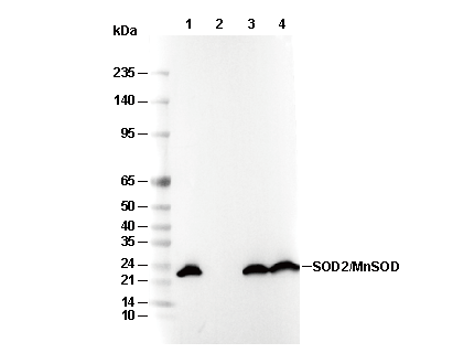 • Lane 1: HEK-293T, Lane 2: HEK-293T (KO SOD2), Lane 3: SH-SY5Y, Lane 4: Rat brain