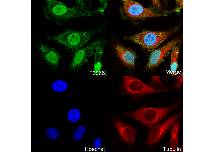 • Immunofluorescent analysis of Hela cells using F2968 (green, 1:200), Hoechst (blue) and tubulin (Red).