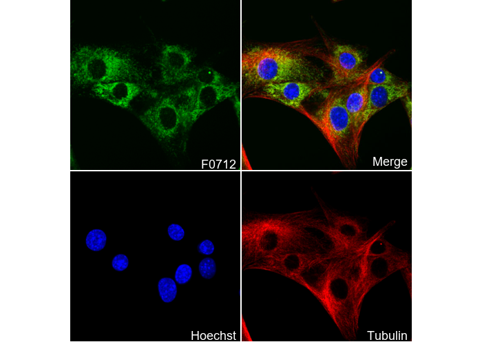 • Immunofluorescent analysis of C2C12 cells using F0712 (green, 1:100), Hoechst (blue) and tubulin (Red).