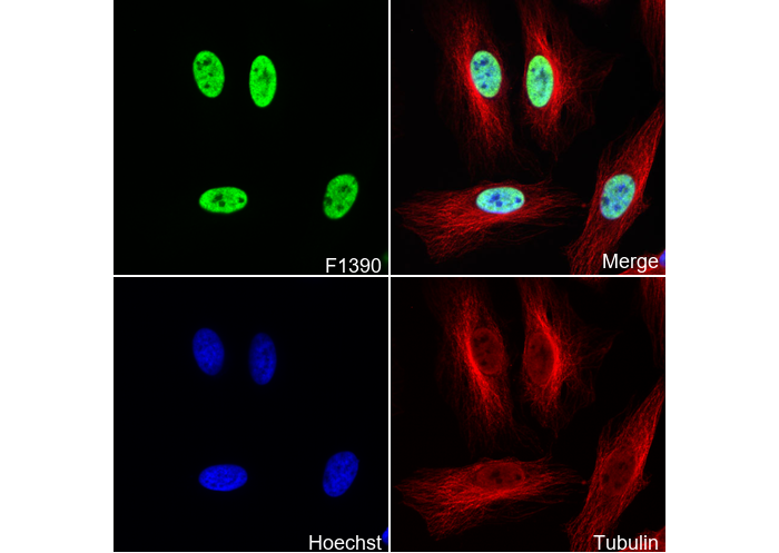 • Immunofluorescent analysis of Hela cells using F1390 (green, 1:100), Hoechst (blue) and tubulin (Red).