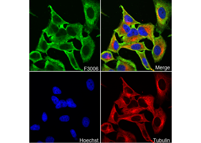 • Immunofluorescent analysis of Hela cells using F3006 (green, 1:100), Hoechst (blue) and tubulin (Red).