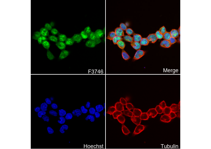• Immunofluorescent analysis of F9 cells using F3746 (green, 1:100), Hoechst (blue) and tubulin (Red).